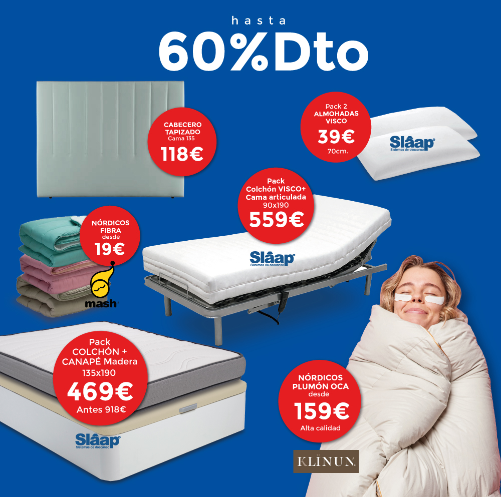 Gracias a nuestras ofertas y promociones encontrarás lo mejores precios y las mejores marcas para cambiar tu colchón, canapé, somier, base… y todos los productos de descanso que deseas.